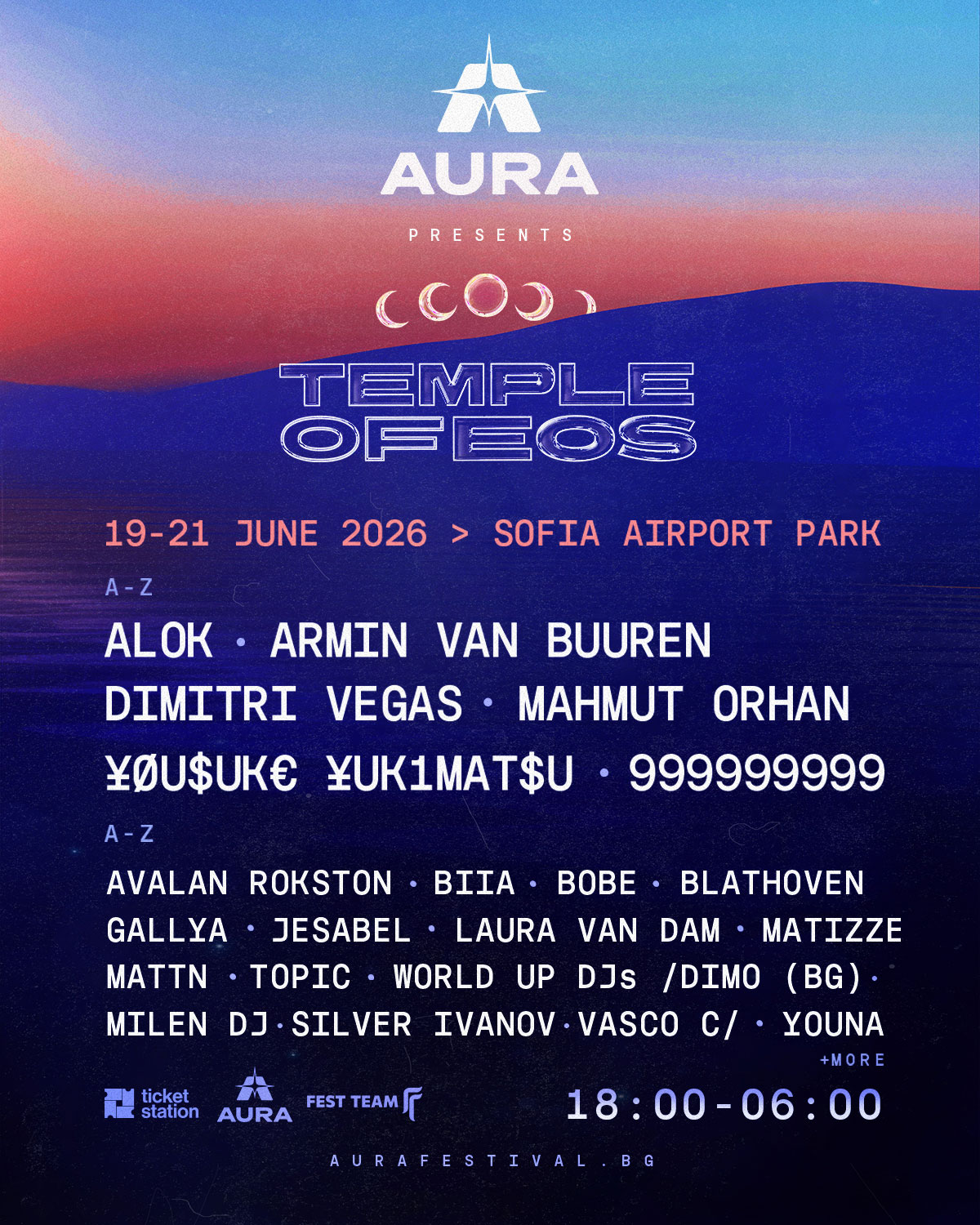 През 2026 година AURA привлича едни от най-големите имена на глобалната електронна сцена – артисти, които обичайно виждаме на Tomorrowland, Coachella или Burning Man ще се качат на българска сцена, за да превърнат София в новата столица на най-актуалните електронни жанрове. Първата фестивална вечер, 19 юни, ще бъде водена от бразилската суперзвезда ALOK, в момента DJ #3 в света и един от най-разпознаваемите артисти в електронната музика с милиони последователи и глобални хитове. След него фестивалът ще премине към нощния си ритуал с Mahmut Orhan – един от най-големите феномени на сцената през последните години, със силно присъствие на водещи световни фестивали и характерен звук, пренасящ публиката в мистична атмосфера, която ще отведе фестивала към изгрева.